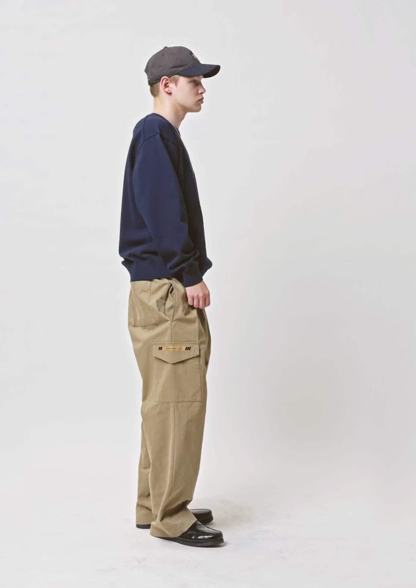 ナイロン/コットン混紡のピーチウェザー生地を使用した2タック6ポケットトラウザーズ。ストレートのワイドシルエット。フロントは重ね合わせの開閉仕様で、ウエストゴムの仕様ながら内蔵されたドローコードでも調節可能。両サイドに配置した大型のカーゴポケットが特徴。カーゴポケット右側に両端の斜線でサイズを表記するプリントネームを付属。